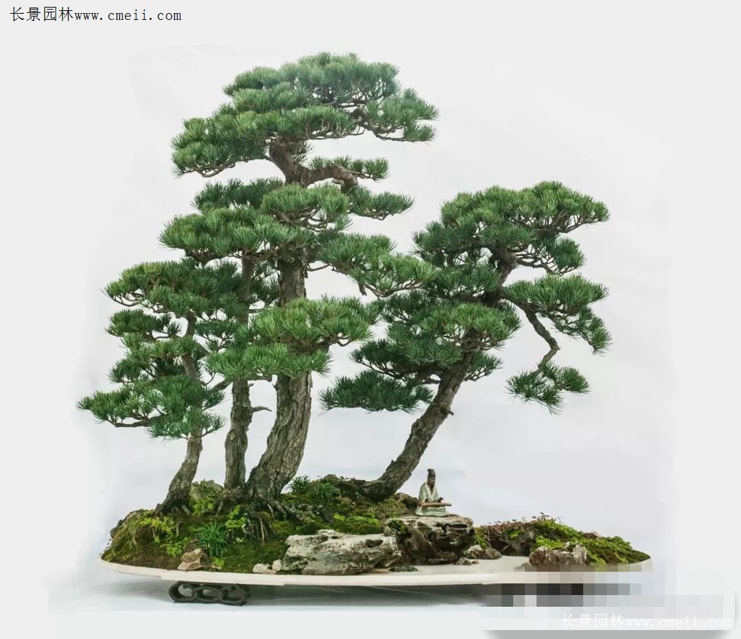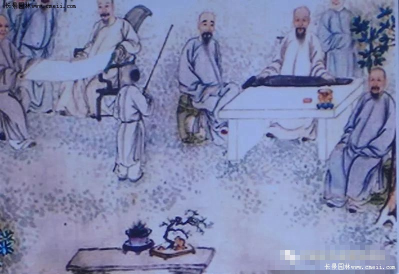 6.王維為什么要在盆中放一塊對蘭蕙的生長盛衰沒有任何關(guān)系的石頭呢?更值得人們深思的是馮摯在記述文字中沒有使用“置”、“放”、“擺”、“擱”等常用字,而選用了一個(gè)讓人頗感意外的“養(yǎng)”字。有人不禁要問:本無生命特征的石頭怎么能“養(yǎng)”呢?唯一的答案只能是,身為唐代大詩人、大畫家、大音樂家的王維,在將自己的繪畫經(jīng)驗(yàn)和“詩言志”、“詩緣情而發(fā)”的詩歌創(chuàng)作理念以及音樂的節(jié)奏、節(jié)拍、旋律、和聲、曲式等藝術(shù)特性和理論等借鑒于盆景創(chuàng)作以后,作為盆景的基本表現(xiàn)元素、本無生命的石頭,就產(chǎn)生了一種奇妙的蛻變。于是,在王維眼中,這塊本無生命的綺石,驟然間華麗轉(zhuǎn)身為一塊擬人化的有生命的“活石”了。而把這樣一塊“活石”“養(yǎng)”起來,也就變得合情合理了。這塊綺石不僅對盆景營構(gòu)畫面起到了烘托、渲染的作用,更重要的是它滿足了創(chuàng)作者對心理情感、意志品質(zhì)、社會(huì)人生乃至宇宙精神的訴求。可以毫不夸張地說,王維的盆景“養(yǎng)以綺石”,是中國盆景史上一項(xiàng)前無古人、無與倫比的偉大創(chuàng)舉。中國盆景從此有了各種配件的廣泛應(yīng)用,有了藝術(shù)意境的創(chuàng)作追求,有了詩情畫意的審美境界。更為重要的是王維的這一創(chuàng)舉,對確立中國盆景的藝術(shù)地位,起到了至關(guān)重要的催化、支撐和穩(wěn)固的作用。王維的“養(yǎng)以綺石”還歷史性地開創(chuàng)和規(guī)范了中國盆景的基本表現(xiàn)模式,即石與植物的組合。王維的這種盆景模式,受到后世文人特別是文化精英們的熱切關(guān)注和大力推崇。如施耐庵就曾在其名著《水滸傳》(第81回)中專門寫過宋代的松石盆景:浪子燕青拜訪京師名妓李師師,“入到客位前,見周回吊掛名賢書畫。階檐下放著三二十盆怪石蒼松。”而元畫家李士行的《偃松圖》以及清葉芳林、方士庻的《九日行庵文燕圖》(圖4)等,畫的都是樹與石結(jié)合的盆景。再看看當(dāng)代中國盆景,其表現(xiàn)形式豐富多彩,而樹與石組合的盆景更是琳瑯滿目。不管是以樹為主兼以體量很小的單體點(diǎn)綴石組成的盆景,還是以石頭為主兼以樹木為輔的山水盆景、樹附石(圖5)盆景,抑或是石、樹所占比例相差不大甚至幾乎均分的水旱盆景、樹石盆景(圖6)等等,無不是王維盆景制作理念、方法、模式的延續(xù)和拓展。已故著名中國盆景藝術(shù)大師賀淦蓀先生提出的“樹石盆景”概念及其高足、中國盆景藝術(shù)大師張志剛君所著《中國樹石盆景》一書的文化源頭和理論根據(jù),就在這里。