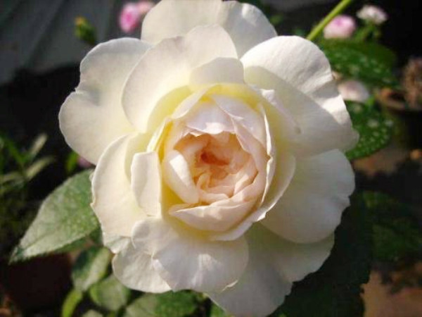 月季波萊羅一次開花可達四五十朵,一年四季均可開花,且花朵非常厚實,外圍呈白色,近白色或白色混合,里面還透著一點點嫩粉色。等到波萊羅花芯微露時,就是它的好觀賞時刻。