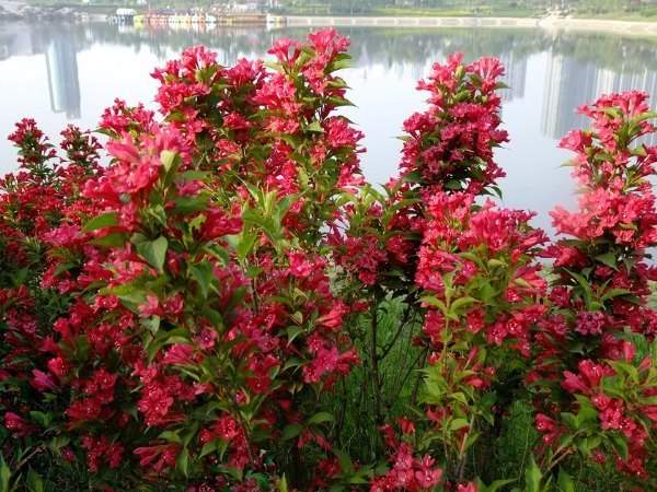 紅王子錦帶花,花色艷麗繁茂,開花時分紅綠相間,而且能在河畔潮濕環(huán)境中生長良好,是非常好的河畔觀賞植物。